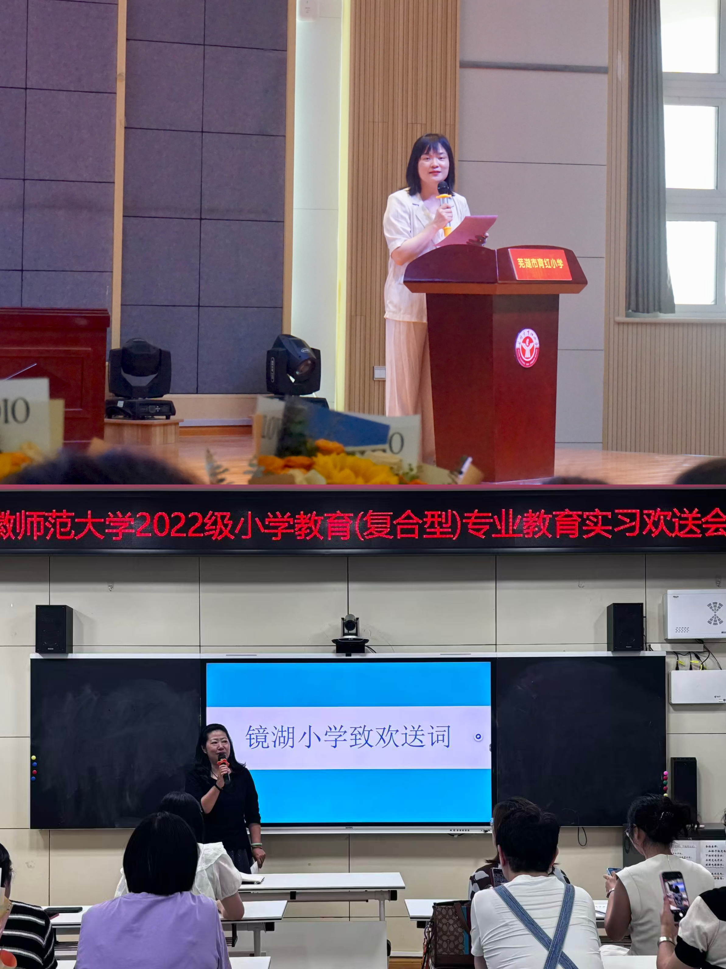 大会伊始,一部由实习生自主制作的纪实Vlog带领全场重温了三个多月的温暖历程。视频中,实习生们在课堂上的专注授课、与学生课后的欢乐互动、教研活动中的积极研讨等画面一一呈现,生动展现了实习生们在育红小学、镜湖小学的成长轨迹,也勾起了在场师生的美好回忆,现场暖意融融。