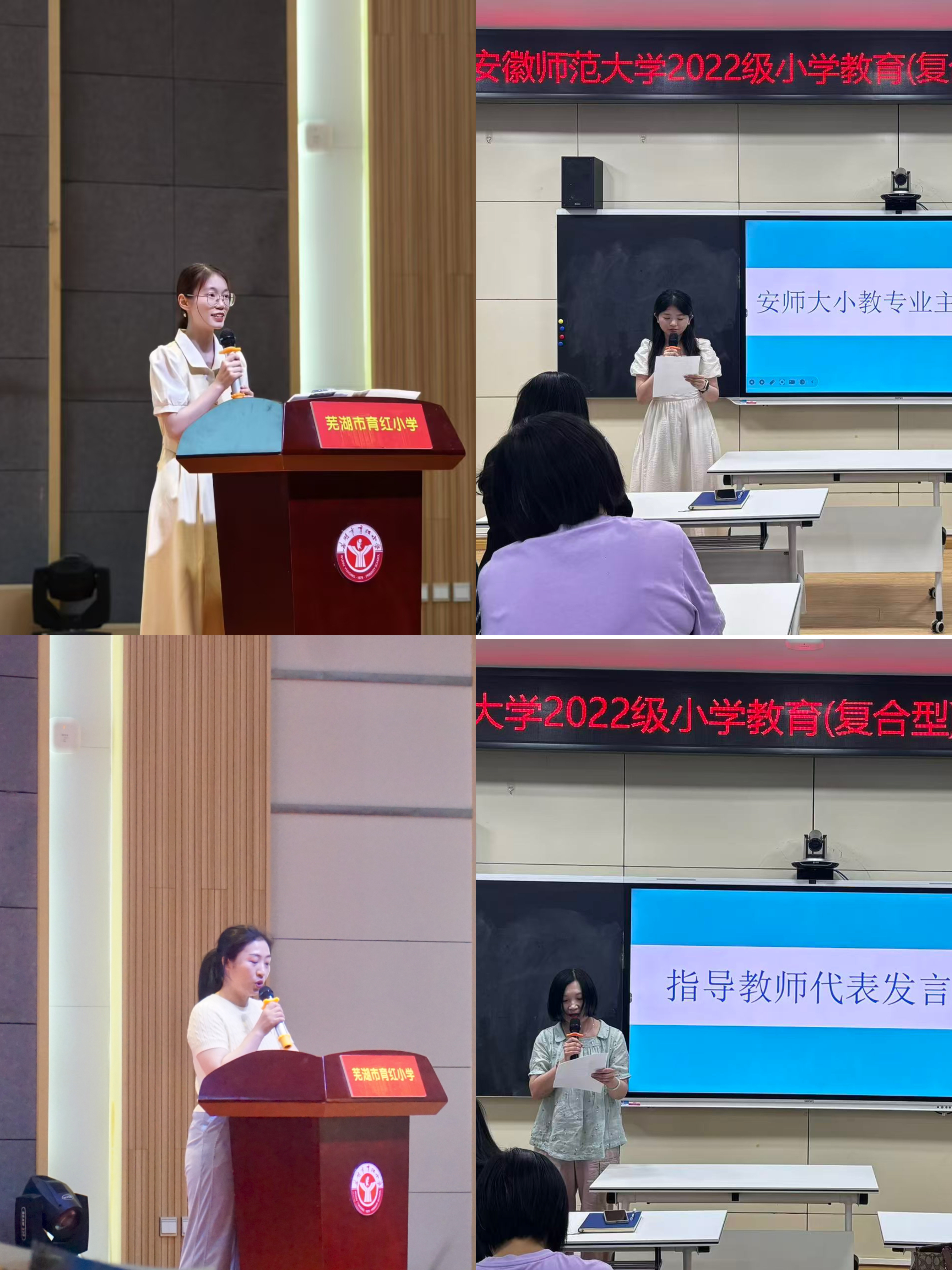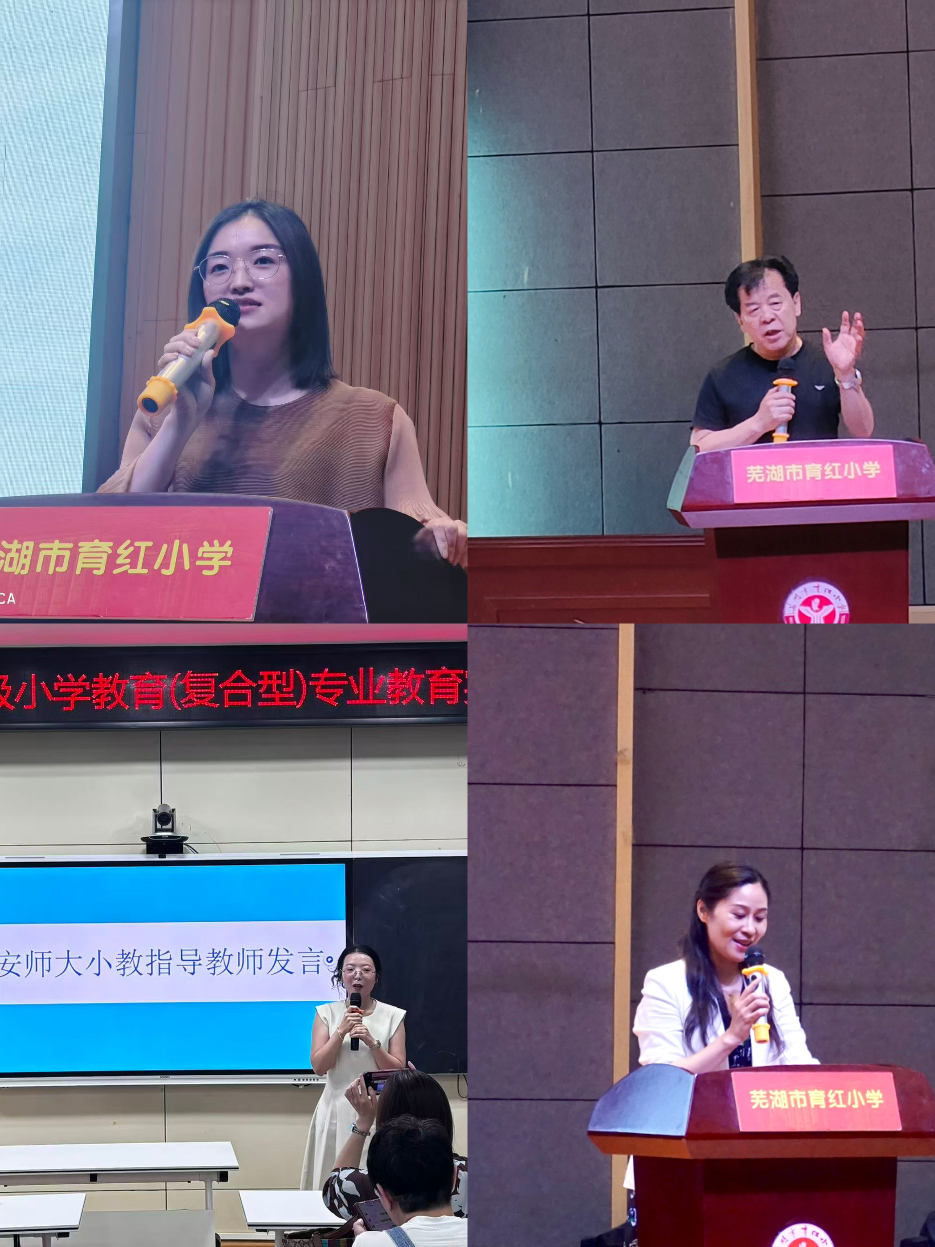 专业负责人陈晨老师、校内指导老师姚运标、胡微老师分别对育红、镜湖小学倾力提供优质实践平台并精心培养表示感谢,并希望双方能够继续深化合作,共同为培养优秀的小学教育人才贡献力量。他们也对实习生三个月以来的辛勤付出给予了充分的肯定和赞赏,希望他们将教育实习中学到的本领在理论和实践领域继续发扬光大,永葆育人初心,在教育道路上不断前行。育红小学校长贾红娟用“以爱育人”“以学促行”“以梦为马”三句箴言作结,肯定实习生的同时,更期待未来能共绘基础教育新图景。