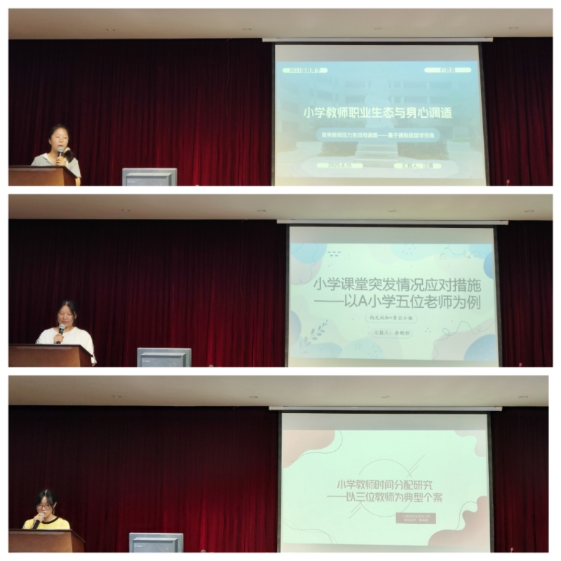 22级与23级各小组先后开展汇报。汇报内容主要是各小组围绕小学教育开展的调研:学思组指出教师受非教学事务压力,建议规范职责;行致组关注职业生态与身心调适,反思调研伦理;灯竹小组分析课堂导入情况;行知书话小组从教育现象学视角,提出优化空间等建议;笃行小分队探讨六年级班主任德育问题;清源学习小组研究“生本课堂”困境;向无而知和青云小组调研课堂突发应对;向阳而生小组构建班主任情感介入模型;致知小组与启明星小组均聚焦非教学事务压力,呼吁为教师减负。