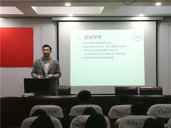 首先程啸老师分享了他的备考经验。他结合2018年备考安师大辅导员的经历,从笔试、面试以及实践考核三个方面进行全面讲解。程老师强调,准备笔试时要熟记辅导员相关的常用政策文件,了解辅导员的相关知识和具体工作。在准备面试时,同学们要注意仪表和着装,答题时要认真思考、谨慎作答。在实践考核时,要做好实践计划,打造特色活动。在结束的考核汇报时应自信而务实,进行中肯的自我评价。