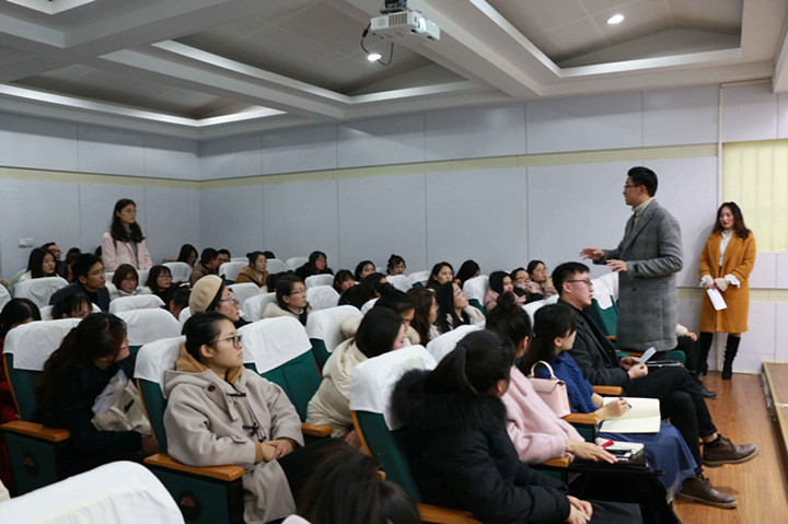 讲座伊始,主持人对参加此次讲座的三位优秀辅导员和同学们表示热烈欢迎,并隆重介绍了三位优秀的辅导员。接着简单介绍了本次讲座的主要内容:本次讲座主要分为两个部分:一、分享经验,辅导员分享备战高校辅导员考试时的经验;二、互动环节,三位优秀辅导员与同学们自由交流,为同学们答疑解惑。