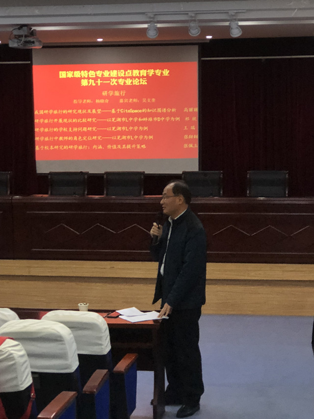 本次论坛的目的在于发挥我院国家级特色专业教育学专业优势,旁征博引,薪火相传,以提升学生的学术素养及专业技能。论坛按照事先安排的顺序依次进行个人汇报研究与经验,报告的五位学生分别围绕《我国研学旅行的研究现状与展望》、《研学旅行开展现状的比较研究》、《研学旅行的学校支持问题研究》、《研学旅行中教师的角色定位研究》、《基于校本研究的研学旅行:内涵价值及其提升策略》等五个主题进行阐述,内容上各有侧重,研究视角也各不相同。个人汇报结束后,进入了激烈的集体讨论环节,大家踊跃提问,共同探索研学旅行各方面的问题。最后是精彩的教师点评环节,对于研学旅行这个研究热点,吴支奎副教授深入地分析了研学旅行的背景、课程化领域、学科教学融合、核心素养培育、校本化实践等多个方面,引发学生们对研学旅行更深入的思考和启发。