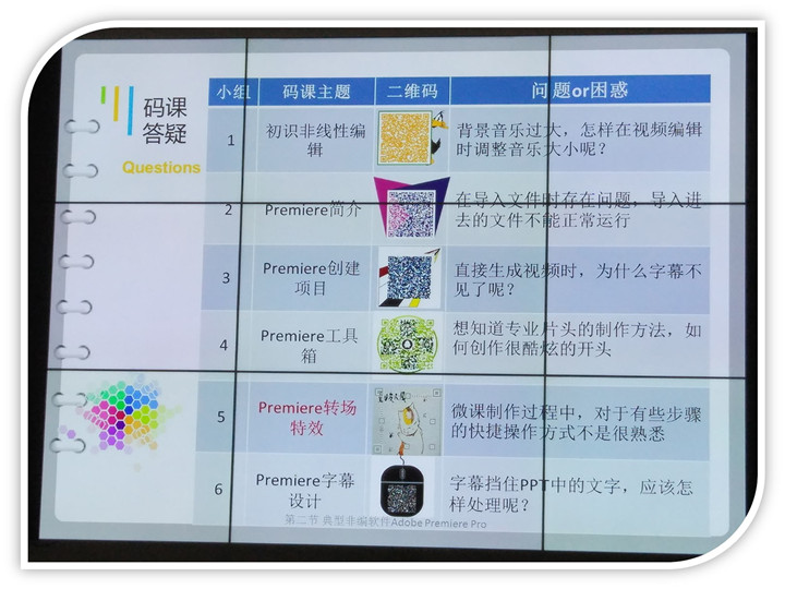 杨老师这堂课的主要内容是“数字音视频处理?——Adobe Premiere Pro的使用”。首先,杨老师通过解答课后同学们在制作“码课”作品过程中遇到的问题来帮助大家回顾学过的知识。通过回答6个小组提出的不同问题,有效的解决了学生在实践过程中遇到的困难和疑惑,加强了同学们自主学习的信心。之后,通过二维码分享了学长的优秀作品,引导同学们扫码在线观看本节课的微课视频。观看结束后,杨老师结合实际操作,耐心细致的讲解作品制作中涉及到的技术关键点和细节要领,指导学生同步进行练习。短短的20分钟教学过程,同学们学会了视频的多层叠加、放缩、擦除变换、关键帧的定位和插入、运动和位置特效的使用等技能。这种在线微视频、跟随式指导和现场动手实践相结合的授课方式也产生了很高的学习效率,即便教育学专业学生的前序知识不多,也能够顺利跟上教学节奏。通过课后交流,发现同学们对技术相关的内容不仅不畏难,反而觉得有兴趣、能学会、还想学。