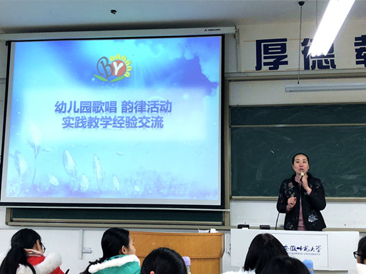 本网讯(教科院 姜雪)20171214日下午两点,在田家炳教育书院8202教室,2015级学前教育专业《学前儿童音乐教育》课程再次邀请一线优秀教师走进大学课堂教学。今天赵学菊老师为我们请到的主讲人是芜湖市百蕊幼儿园的杨斌园长,同时还邀请了芜湖师范学校幼儿园音乐教法任课教师王艳共同参与课程教学中。