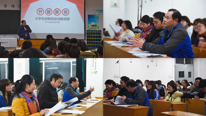 报告会开始,刘和海老师简述了创新创业项目的意义及会议总体流程,要求各项目队长依次从项目研究背景及意义、研究内容、研究方法、技术路线、进度安排等方面进行十分钟左右的开题汇报。首先进行答辩的是朱丹丹同学,她的选题是《PPT微视频学习网站设计与开发》。她指出目前PPT网站开发中普遍存在针对性、纯技术、纯理论的问题,不利于学习者学习,拟通过微视频开发与网站开发两个维度进行研究,以提高教学的有效性。她的汇报采用思维导图呈现,有理有据,完整清晰。詹雅灵同学汇报主题是《自动化微课制作系统选题》,通过对国内外微课制作系统的现状梳理,从VS-Mini微课系统、易捷微课制作系统等中寻找自动微课制作系统的设想:自动化影音同步,自动化讲师和自动化字幕等,汇报过程简洁,研究思路清晰,研究目标明确。最后是范晨晨同学的创业项目:《青芒教育资源有限公司》,重点汇报了创业公司的服务项目、特色与优势,并进行了SWOT分析,强调了其发展设想与战略规划,汇报过程层层推进,主旨明晰,尤其能结合专业需求,做到有方向、有计划、有策略地发展公司。开题中,三位指导教师分别从不同角度对每个开题汇报提出了中肯的建议与意见,如表达不够准确,想法不能过于空洞,研究目标要更加明确,问题来源于实际,要重视项目的可行性等等。