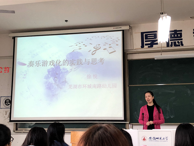 本网讯(教科院 姜雪)2017112日下午,在田楼8202教室,赵学菊老师邀请芜湖市环城南路幼儿园的徐悦园长走进2015级学前本科课堂,结合《学前儿童音乐教育》课程为同学们带来一场生动活泼的实践教学。