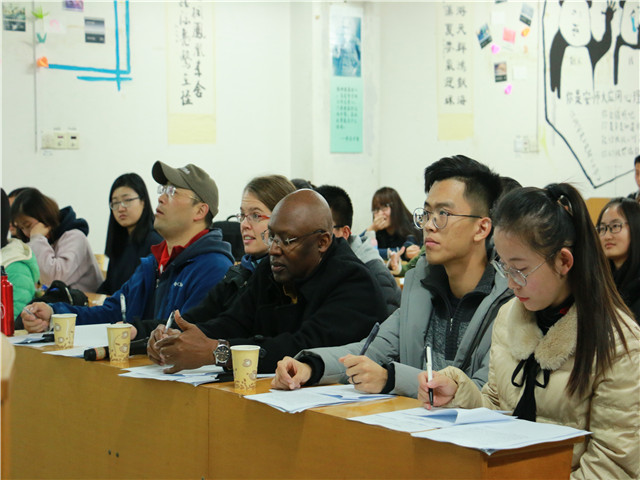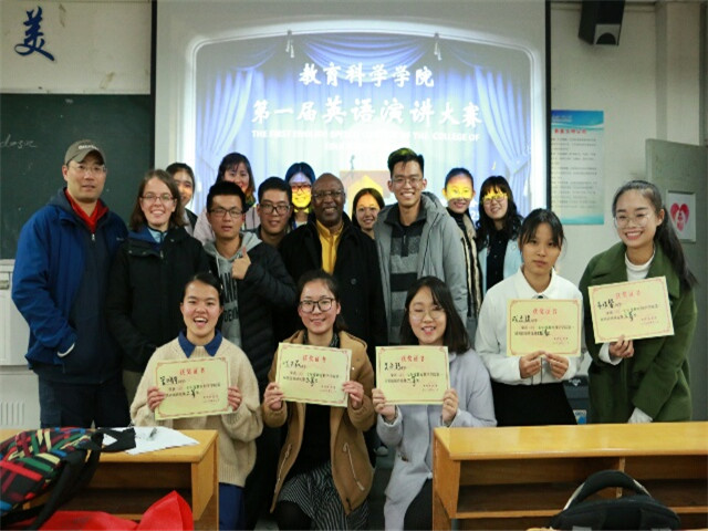 本网讯(教科院 张曼)为营造我院英语学习气氛,丰富校园文化,11月25日晚7点,学院第一届英语演讲比赛决赛在田家炳教学楼8408拉开帷幕。本次决赛评委由美国布莱诺大学教育学院院长Eugene教授,南京外国语学校 Mandy女士与Alex老师,学生会主席张照辉和学生会副主席马舒婷担任。
