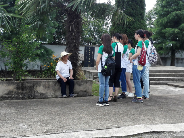 穿过漫山遍野的茶树,团队成员来到被农田包围着的夏雨初烈士陵园,烈士后人--八十四岁高龄的夏道胤老人从家里赶来热情接待,并向队员们娓娓道来夏雨初革命烈士的生平事迹。夏道胤老人从小受叔叔夏雨初的英雄事迹影响,六十四年来,在各地义务宣讲革命故事一千两百多次,团队成员围站在他身旁,认真聆听他的讲述。
