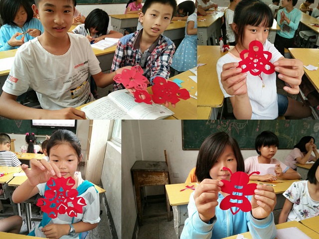 为传承剪纸艺术这一中华民族文化艺术瑰宝, 7月3日上午,团队两位成员结合自身专业特色与技能,指导学生开展了一次手工剪纸课。从剪纸理论到亲自动手剪纸,孩子们一声声“老师,这个怎么剪”、“老师,您能帮我画一只松鼠吗”“老师,看看我剪的兔子”,让团队成员感受到得是他们对剪纸的喜爱与兴趣。经过团队成员细心的指导,孩子们满怀信心地开始了新一次的尝试。经过将近两个小时的亲自尝试,孩子们完成了属于他们自己的剪纸作品。许多的孩子还将自己的作品进行了展示,并且送给了他们喜欢的朋友。通过此次手工剪纸活动,不仅带孩子们一起亲身领略了我国民间伟大的剪纸艺术,也增强了学生的动手能力,让孩子的动手中收获实践的快乐,从做中学。