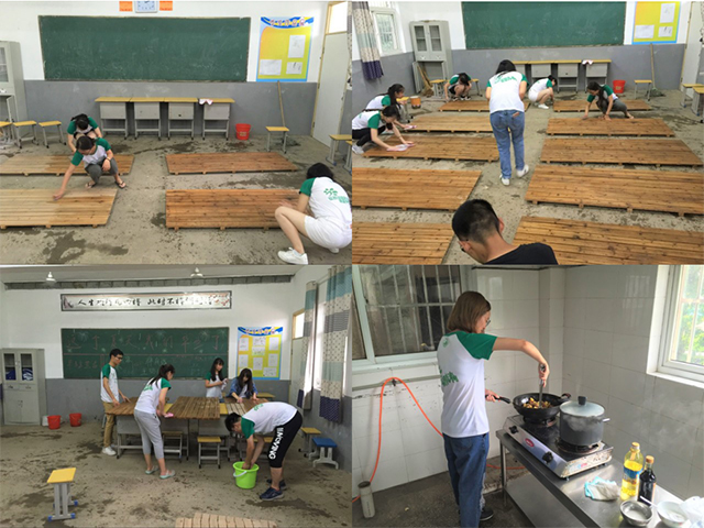 风雨如晦,连续两天的狂风暴雨给出行带来了很大的困扰。队员们仍然尽心尽力完成任务。在目的地,队员们在学校安排的“宿舍”擦床板,抹桌子,一盆盆脏水洗净灰尘层积的床板,一块块抹布擦亮不复光洁的课桌。成员们通过劳动进一步认识到此次社会实践的艰苦,同时也坚定了奋勇前行,完成实践的信心。一个下午的分工协作不仅整理出了别具一格的宿舍,也增进了队员们的感情,提高了团队合作能力。