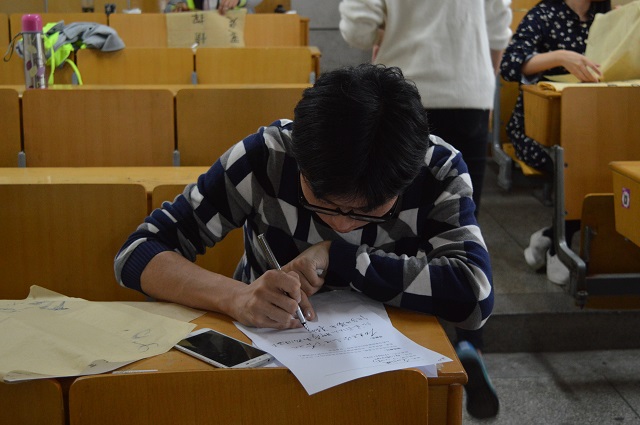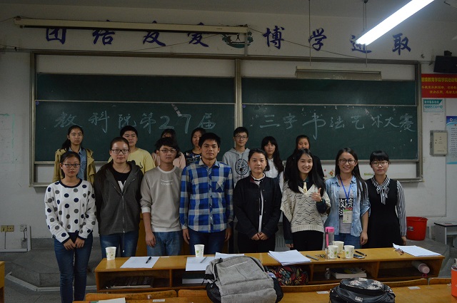 本网讯(教科院 张启山)一撇一捺一字间,一纸一笔一人生。1016日,教科院院会在8302教室举办了第27届“三字一笔”大赛,同时纪念长征80周年。本次比赛由教科院学生会主席叶品、梦飞翔学社社长赵静文、生科院学生会宣传部部长朱宗波、化材院学生会宣传部部长吴昊、教科院宣传部部长马舒婷同学担任评委。