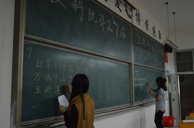 随后的粉笔字也是龙飞凤舞,雄健撒悦。黑板上那首《七律 长征》更是负载了长征路上的千辛万苦,也饱含着中国共产党的万般豪情壮志。在一个多小时的比赛时间里,同学们尽情地书写着,创作着。选手们的作品都各具特色,真是百花齐放,同时评委也本着公平公正的原则为每位参赛者打分。