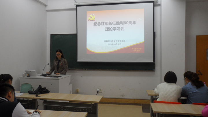 本网讯(研究生 罗菊)80年前,中国工农红军胜利地结束了二万五千里长征,在中国革命史上写下了耀眼的一笔。历经80年的岁月长河,用热血铸就的长征精神仍然深刻影响着一代代中华儿女。10月26日下午,我院14级研究生党员齐聚研四教室,深情回顾长征路,学习伟大长征精神。学习活动由组织委员童张梦子主持。