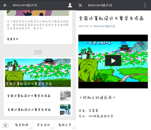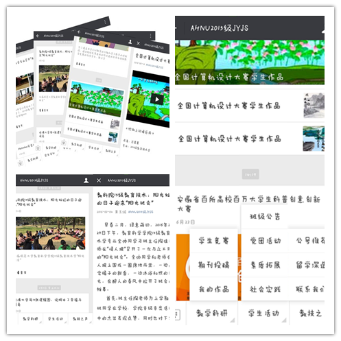 平台开通后,受到广大师生及学生家长的共同关注,截至目前为止,平台已经推送了2015级教育技术学网络“型”动、教科院15级教育技术:阳光灿烂的日子迎来“阳光班会”、2015级教育技术学专业召开“我与专业共发展”主题班会、全国计算机大赛学生作品等多个班级资讯及作品展示等。在每一位教育技术学成员的关心和努力下,班级官微版块建设已搭建完毕,各版块内容也逐步充实完善。目前版块主要分为教学科研、学生活动、教技之声三方面,很好的将学习资源、班级资讯及学生作品等归类划分。班级官微的logo设计也是本班同学依托专业知识的原创成果。