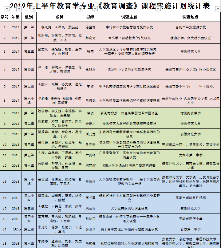 临行前的最后一周,学院、专业和导师们为各小组一一联系和确定调查基地并开具介绍函。本次教育调查所涉及的调查地点丰富多样,层次上涵盖小学、初中、高中、大学等各级各类学校。既有安师大附小、镜湖小学这样的基础教育名校,又包含安徽师范大学和安徽工程大学一类的高等院校。区域上覆盖城镇及乡村,既有安庆潜山野寨中学校这样的农村学校,又有芜湖市第一中学这样的城市学校。综合来看,各组的选址都具有一定的代表性和合理性。另外,为了充分保障学生群体的出行安全,学院统筹安排,从导师到每一个学生,都为每一个参与者购买了人身保险,以保证每一个成员在学习和生活上都无后顾之忧。