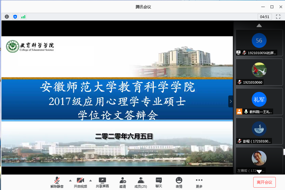 【本讯网/ 彭程 王礼军】为确保疫情防控期间2020届毕业生如期毕业,我院决定通过线上云答辩的形式完成毕业生的学位论文答辩工作。6月5日,2017级应用心理学专业10名毕业生依托腾讯会议平台进行了线上学位论文云答辩。答辩会主席是来自北京师范大学博士生导师边玉芳教授,答辩委员分别是我院桂守才教授、王道阳副教授、严开胜副教授、全莉娟副教授、何元庆副教授。王礼军老师担任答辩秘书。旁听本次线上答辩的有2018和2019级应用心理学专业学生。