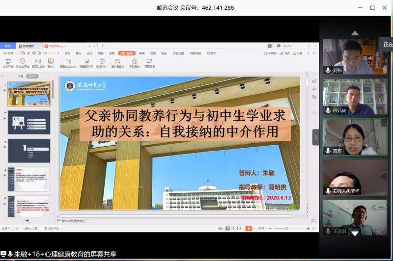 (本网讯 教科院 汪晴 王礼军/文)为贯彻落实党中央关于坚决打赢新冠肺炎防控阻击战总体战的精神,降低疫情对我院硕士研究生毕业和就业等造成影响,6月13日上午8时我院2018级心理健康教育专业硕士研究生在线上开展毕业论文“云答辩”工作,27名毕业生分为两组同时进行。参与答辩的专家共13人,其中答辩主席分别是上海师范大学刘伟教授和清华大学学生心理发展指导中心主任李焰教授,其他专家有芜湖市第四人民医院心理科副主任医师吴明飞、安徽师范大学附属中学正高级教师王为民及本校葛明贵教授等人,答辩秘书2人。答辩流程与传统答辩一致,主要包括毕业生汇报论文、专家提问、毕业生回答问题、专家评议及评议结果公布五个环节。答辩于12时30分结束。