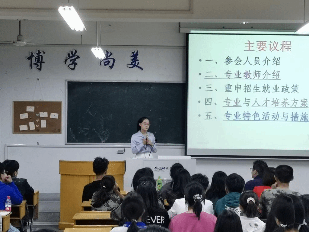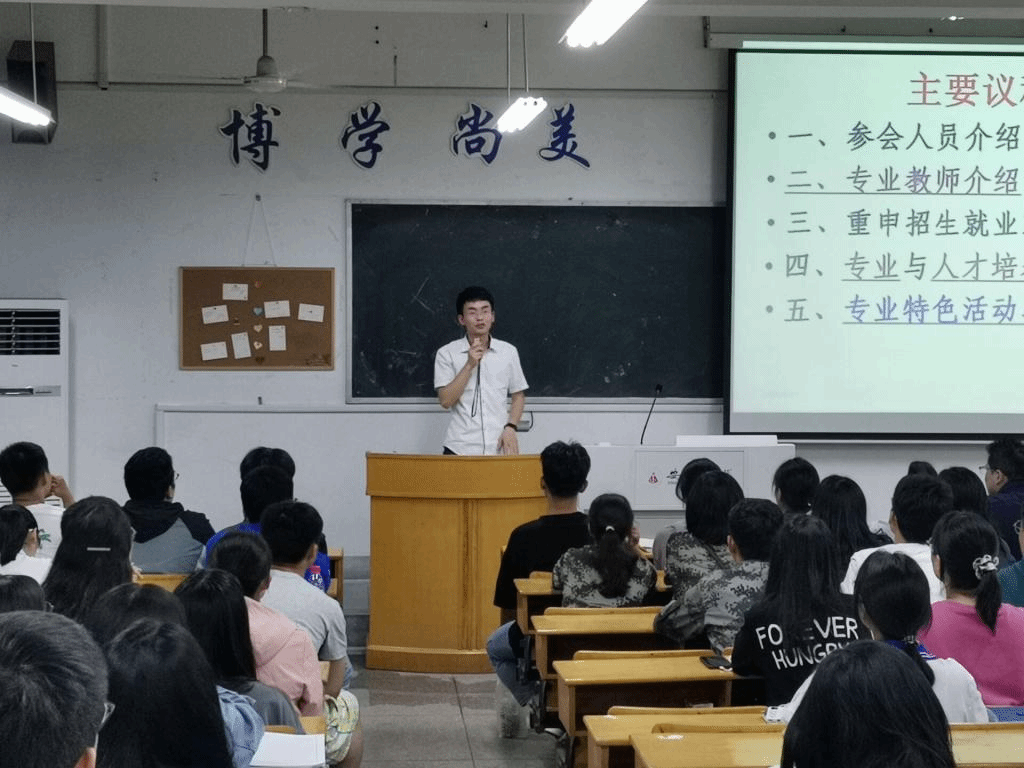 会议分为六项议程,分别是介绍参会人员,介绍专业老师,招生就业政策的重申,介绍专业与人才的培养方案以及专业特色活动与措施。