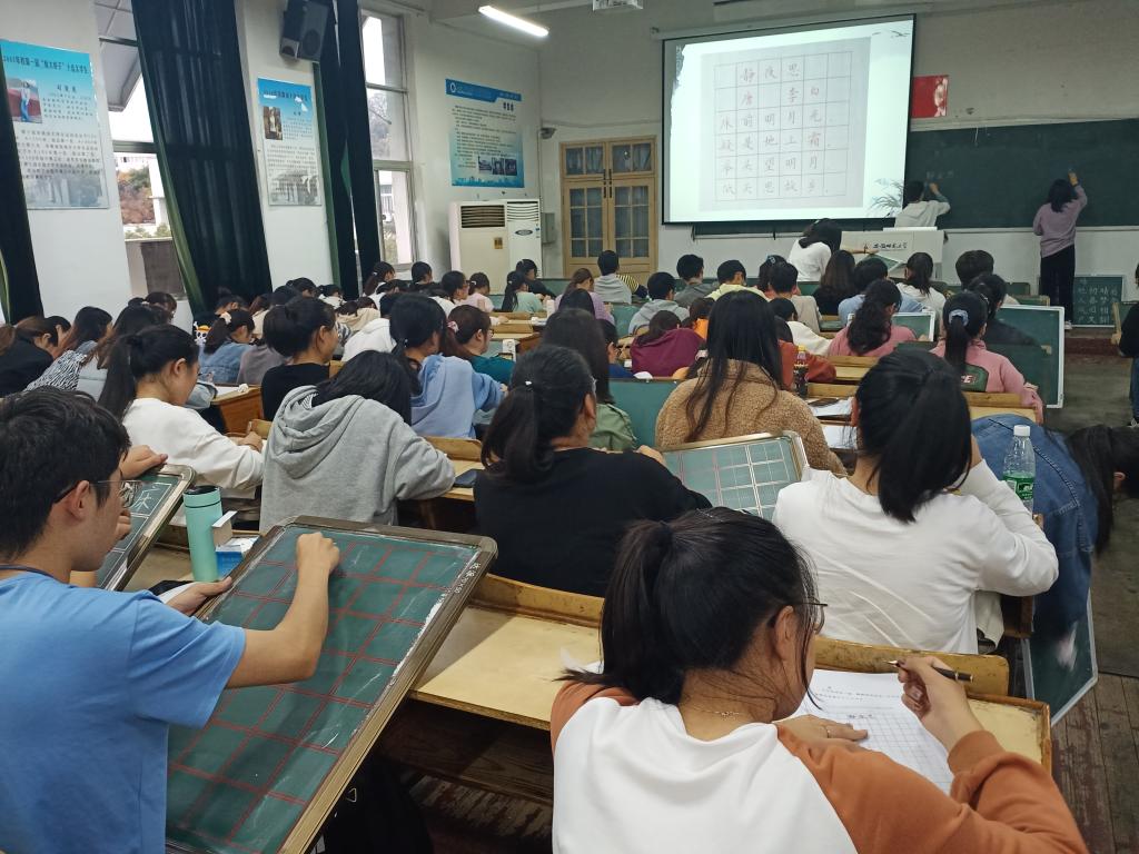 紧张的比赛结束后,为了帮助同学们掌握书法练习的正确方法,小学教育专业负责人王芳主持开展了“尹娟娟老师做客小学教育专业‘三名’讲坛”活动。尹娟娟老师是安徽省书法协会会员,作为一名书法老师,同时也作为小教的学姐,给小教同学们讲了一场生动且有趣的书法课。课上,尹老师强调,书法教育愈加紧迫,想要成为一名优秀的老师,练好书法非常重要。尹老师结合自己的工作经验,针对比赛中同学们的书写状况,归纳出钢笔字、粉笔字书写中存在的问题,并给同学们找到了具体的解决方法,想要写好字,临摹必不可少,其次笔画是基础,控制好速度,注意上下左右结构,学会抓主笔,大小要统一,还要注意书写时捻转粉笔,注意排版,切勿随意涂改。尹老师举一反三,各个击破,将同学们易犯的书写错误和一些易错字的基本笔画都详细讲解,还请了好几位同学上台示范。同学们不仅听得不亦乐乎,而且写的津津有味,原来从前觉得枯燥的书法练习还有这么有趣的一面。