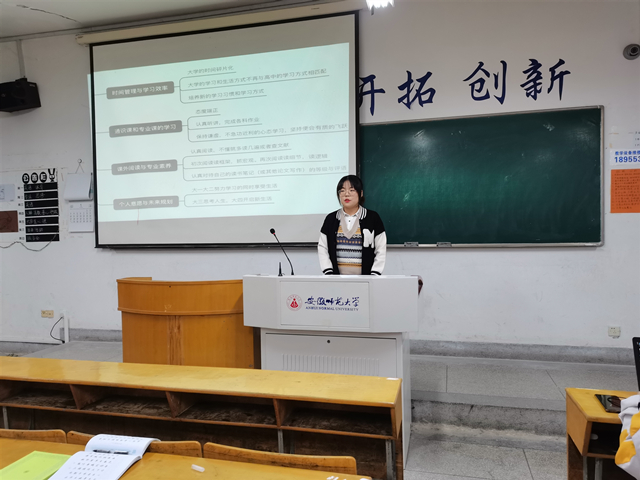 交流会上,被北师大录取的艾晶晶从普适性学习方法切入,详细描述了教育学专业的特殊性、发展性的人生规划、具有矛盾性的个人问题等内容。她嘱咐同学们要抓住学习的主动权,注重平时积淀与交流合作,同时也不要忘记享受大学生活,做到劳逸结合、学思结合,在学习之路上不断突破自我。