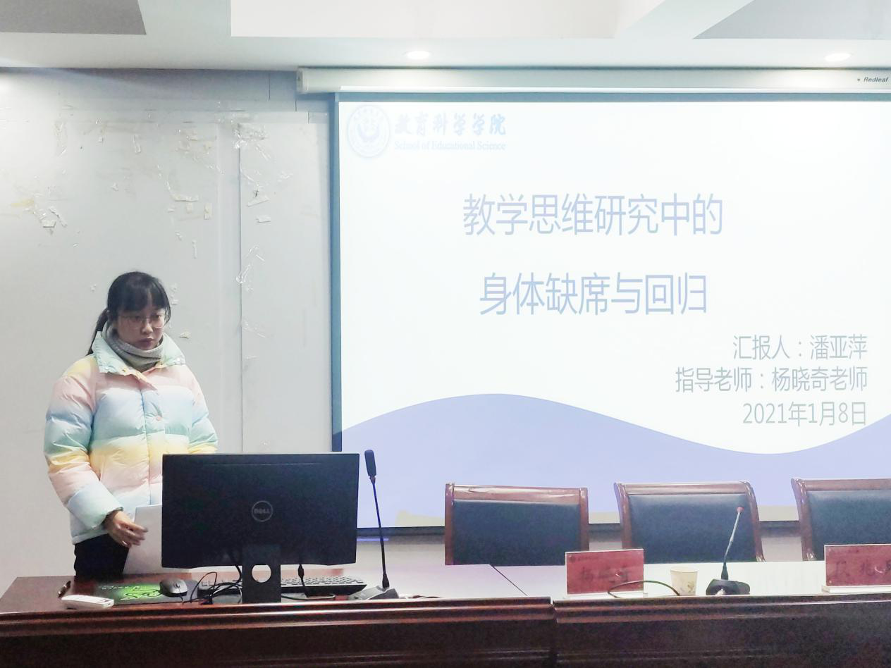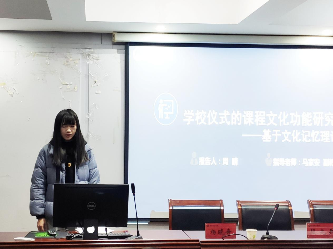 进行学位论文开题报告的研究生依次是周晴、王静、陈学超、邹秀秀、郝倩倩、曲春璐、潘亚萍、梁艺敏8位同学。周晴同学的论文选题为《学校仪式的课程文化功能研究——基于文化记忆理论》。李卯老师建议应首先明确学校仪式与课程文化的关系,即论文中是把学校仪式看成课程文化还是说学校仪式与课程文化是平行关系,其次还建议补充关于学校仪式和课程文化研究的文献综述;吴支奎老师指出学校仪式涉及的内容很多,需聚焦在一个点上进行论文写作;段兆兵老师认为应该先明确文化功能究竟有哪些,然后在此基础上再去探讨课程文化;杨晓奇老师首先肯定了选题的新颖性,但同时也指出应就文化记忆理论对于学校仪式的适切性和理论解释力进行论证说明。王静同学的论文选题为《中小学名师教学洞察力生成的叙事研究》,她从选题缘由、文献综述与研究反思、研究方法与内容、研究创新和写作与访谈提纲五个方面进行了汇报。李卯老师指出论文研究对象和目的不明确,应就中小学名教师洞察力与一般教师洞察力的差异进行解释说明;马家安老师建议完善分析名教师教学洞察力的理论基础;段兆兵老师指出论文在研究思路、结构框架和标题方面应当表述清楚;杨晓奇老师建议要明确是总体的叙事研究还是个体的叙事研究,建立基本的理论分析框架。