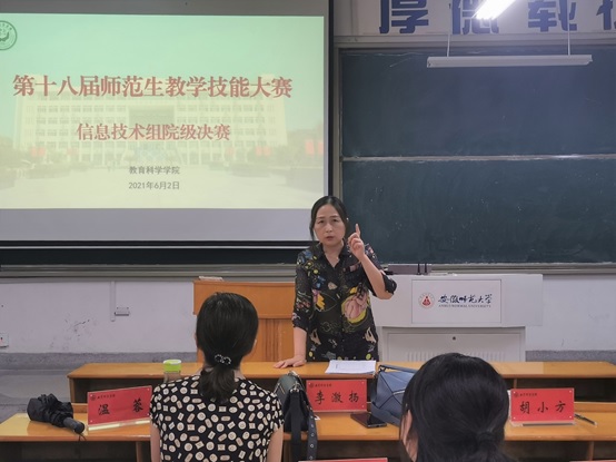 本网讯(教科院 赵小雨 杨滨)6月2日下午14:00,我校第十八届师范生教学技能大赛信息技术组院级决赛在田楼8202教室如期举行。比赛由2019级教育技术学专业本科生龚蕾主持,教育技术学专业负责人杨滨教授,安徽师范大学附属中学信息技术教师李激扬,芜湖市第二十七中学东方龙城校区执行校长、芜湖市中学信息技术教研指导组成员、镜湖区“学科带头人”温蓉,芜湖市华强中学信息技术教师、中学信息技术市教研大组组长胡小方以及教育技术学专业席鹏、陶佳老师担任本次比赛评委。经初赛盲审评选,本次大赛有9位同学进入决赛。2019级、2020级全体学生现场观摩了本次比赛。