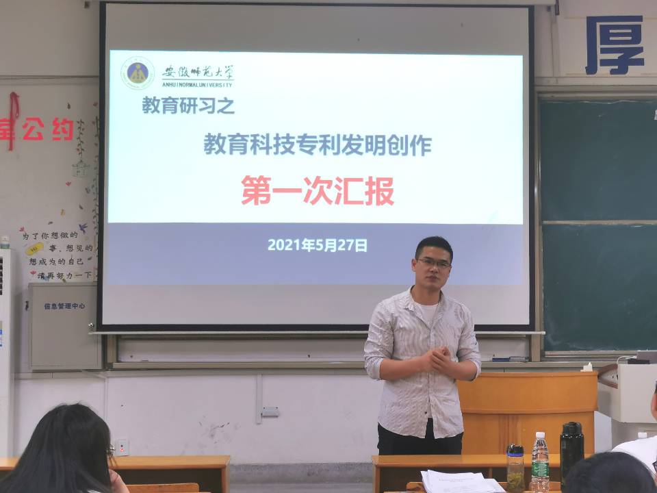 发明显智慧,创新结硕果。教育科技专利发明创作汇报于5月27日下午、6月3日下午分两次进行,教育技术学专业负责人杨滨,专业教师吴文涛、席鹏与辅导员詹雅玲出席活动并担任评委。汇报开始前,吴文涛老师简单开场致辞,指出了活动开展的重要意义,并对同学们的作品内容表示期待。会上,各组学生有条不紊地上台对本组作品进行简要介绍,着重说明了作品的创新技术。评委老师仔细聆听,针对汇报内容提出问题,并给予各个作品准确、有效的改进意见。汇报现场气氛活跃,秩序井然。28组汇报全部结束后,席鹏老师总结发言,向在座同学提出选题、设计方面的建议,同时预祝同学们都能有所收获。