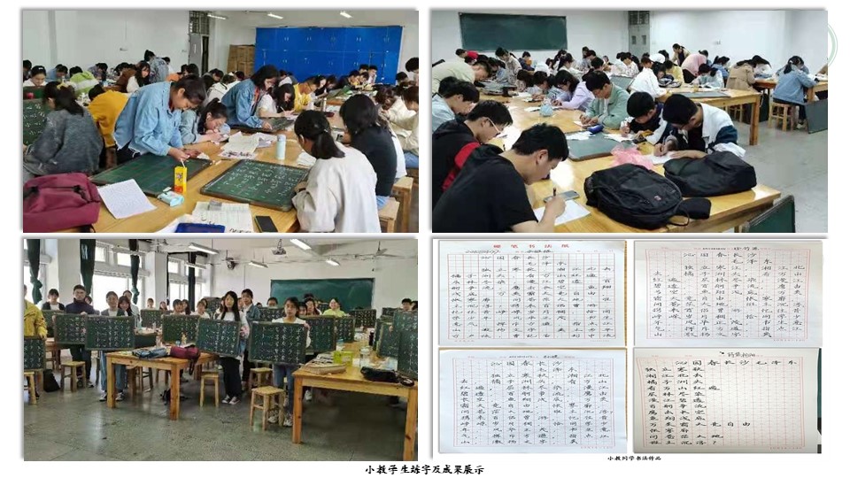 板书、硬笔书法是成为优秀教师的重要教学基本功,所以20级小教本学期还进行了粉笔字、钢笔字的练习活动。同学们除了每周按要求提交作业之外,还要每周在固定时间内集中练习一次,并由学长、书法委员进行指导和检查。同学们手执钢笔,在田字格上写下一撇一捺;紧握粉笔,在黑板上书写行行楷书。五月,教科院举办了“I·教育”基础教育能力大赛。20级小学教育专业学生全部参与此次比赛中,共同展示练习成果,在经过了初赛、决赛两轮比试,最终孙婕同学夺得比赛第一名,徐舒源、蒋黄杨阳两位同学分别荣获二等奖与三等奖。书法比赛是对小教同学练字的质量检测,同时也增强了学生对硬笔书法的重视程度。