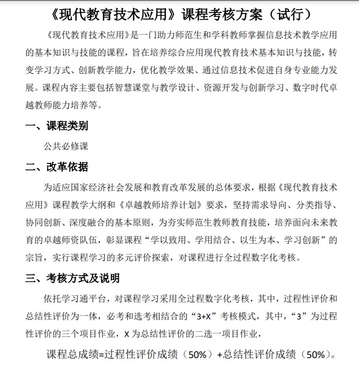 以生为本,考核创新。本学期《现代教育技术应用》课程团队对标师范专业认证标准,以学生为中心,秉承“学以致用、学用结合、以生为本、学习创新”的宗旨,聚焦学生过程化学习,探索课程学习多元评价。对课程进行全过程数字化考核改革。在本学期期末考试中率先启用“3+X”考核方式,依托学习通等平台,集过程性评价和总结性评价为一体、必考和选考相结合的全过程数字化考核取代纸质闭卷考试。新的考核方式一定程度上缓解了传统考试组织流程周期长,环节复杂、考场数量多、监考人员队伍庞大等弊端,同时又在教学过程中创新考核方式,积累了丰富的数字学习足迹。