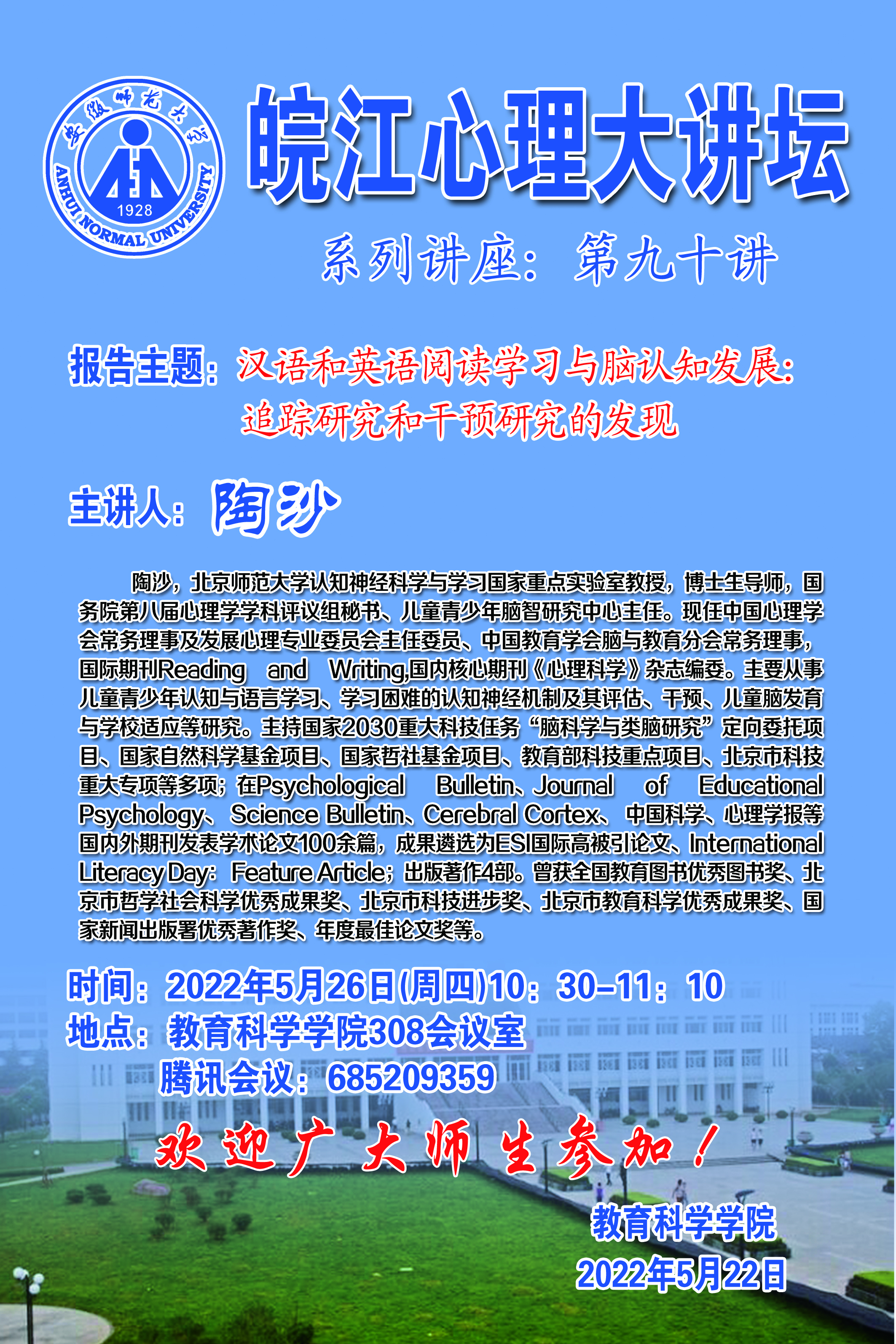 【学术预告】皖江心理大讲坛第九十讲:汉语和英语阅读学习与脑认知发展:追踪研究和干预研究的发现