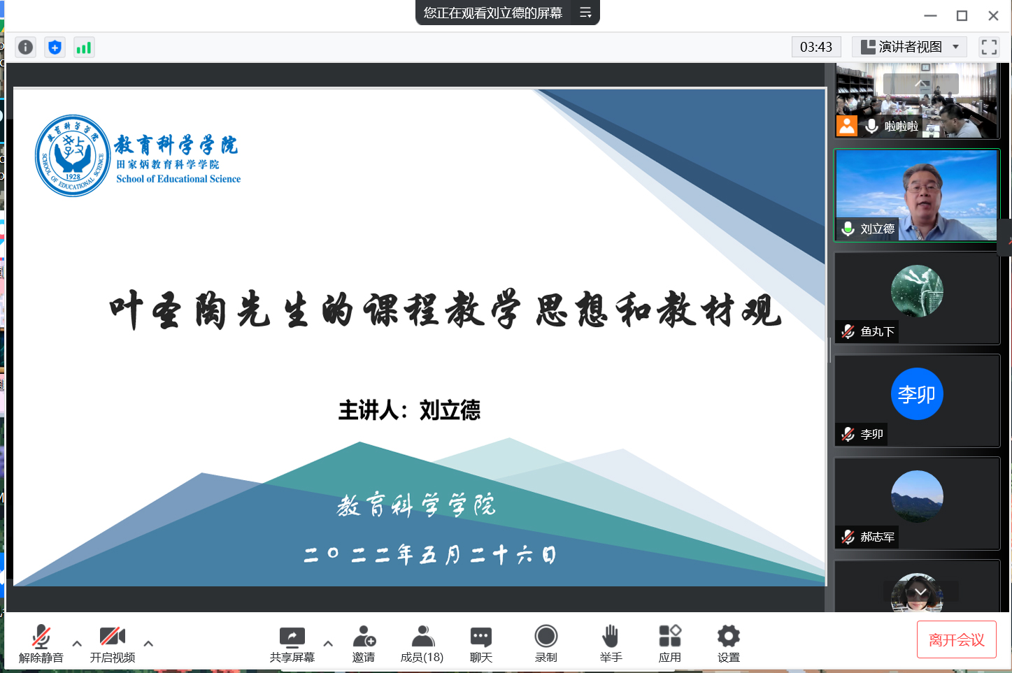 5月26日下午,人民教育出版社党委委员、教育理论编辑室原主任、编审刘立德研究员受邀作“叶圣陶先生的课程教学思想和教材观”主题讲座。本次讲座通过线上线下结合的方式举行,由我院段兆兵教授主持,20、21级课程与教学论专业研究生在408会议室聆听学习。