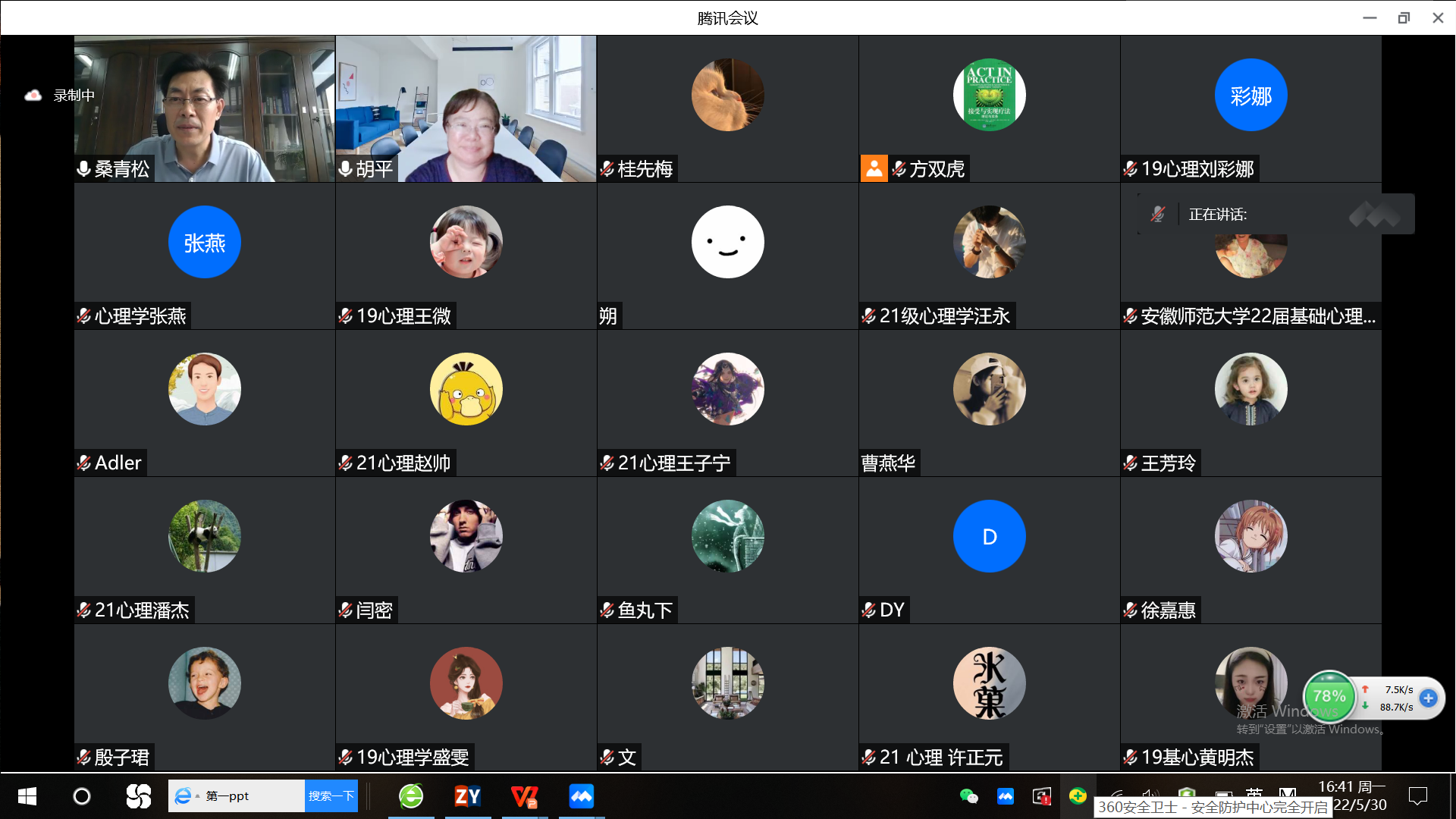 5月30日下午,中国人民大学心理学系系主任、理学院副院长、博士生导师胡平教授应邀做客我院特色系列讲座活动之皖江心理大讲坛第九十四讲,并作了题为《变色龙效应的神经机制》的专题讲座。本次讲座采用腾讯会议线上开展,由我院桑青松教授主持,心理学系教师、2020、2021级心理学专业硕士研究生线上参与学习。