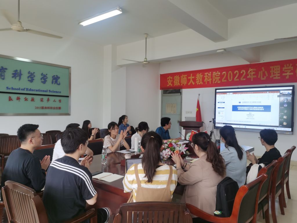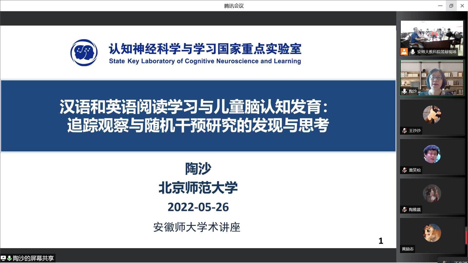5月26日上午,北京师范大学认知神经科学与学习国家重点实验室教授、博士生导师陶沙教授应邀做客我院皖江心理大讲坛第九十讲,作“汉语和英语阅读学习与儿童脑认知发育:追踪观察与随机干预研究的发现与思考”的主题讲座。本次讲座以线上线下相结合的方式,在教科院308会议室和腾讯会议同时进行,由我院桑青松教授主持,宣宾,韩建涛、丁园园、王礼军等心理学老师,全体心理学、心理健康教育学专业硕士研究生参加此次讲座,聆听学习。