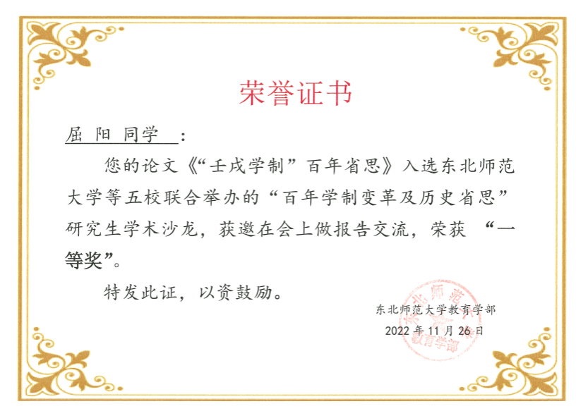 2022年11月26日,由东北师范大学主办,华东师范大学、西南大学、华南师范大学、安徽师范大学协办的“百年学制变革及历史省思”研究生学术沙龙在线上成功举办。论坛共收到论文17篇,我院教育史21级研究生屈阳提交了题为《“壬戌学制”百年省思》论文并作为汇报人作了主题报告,同时,其论文荣获了组委会颁发的“一等奖”。反映了我院研究生良好的学术素养。