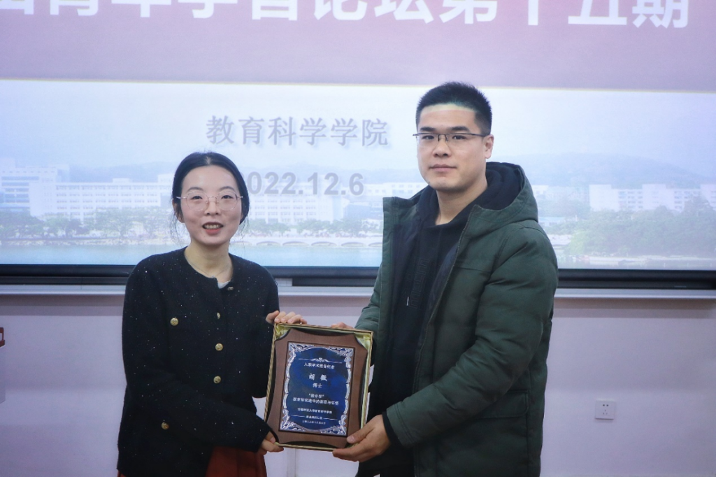 12月6日晚,“赭山青年学者论坛”(第十五期)在教学楼1401教室如期开讲。新进教师胡微博士受邀为在场师生带来了主题为《做中学:教育研究途中的迷思与证悟》的学术报告。副院长吴文涛以及全体教育学类硕士研究生到场学习。本期论坛由2022级研究生张乃迎主持。