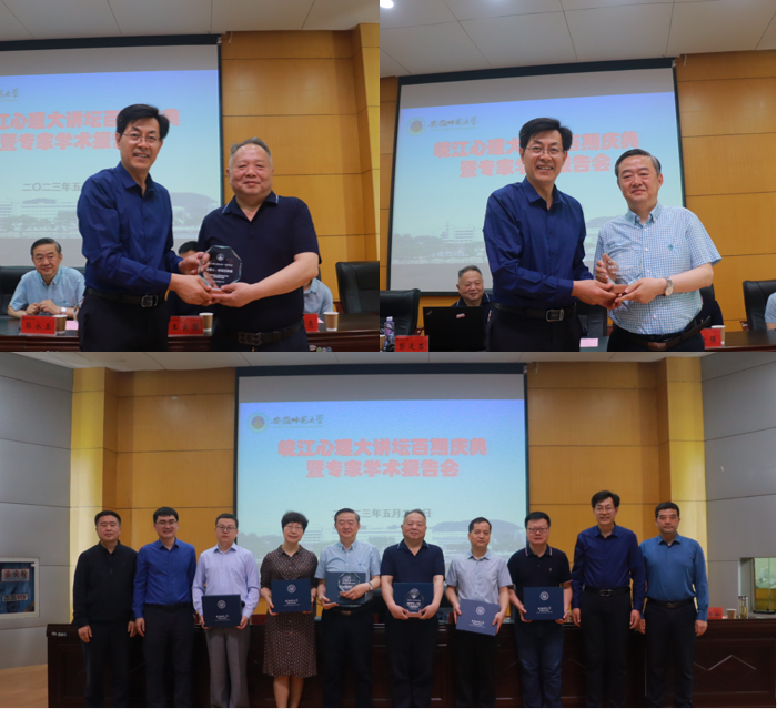 会议伊始,副院长韩建涛向与会师生隆重介绍出席庆典活动的专家,并向专家表示欢迎和感谢。随后桑青松教授简要回顾了皖江心理大讲坛从2011年至今的发展历程,十二载真诚相邀,一百位名师讲授,为我校师生送上一场场学术盛宴。并表示未来持续邀请国内外学术专家做客皖江心理大讲坛同时代表学校和学院感谢本次百讲的两位大咖。紧接着,桑青松教授为第100期主讲嘉宾郭永玉教授和彭运石教授颁发百期庆典纪念品,并邀请各位专家和参会师生合影留念。
