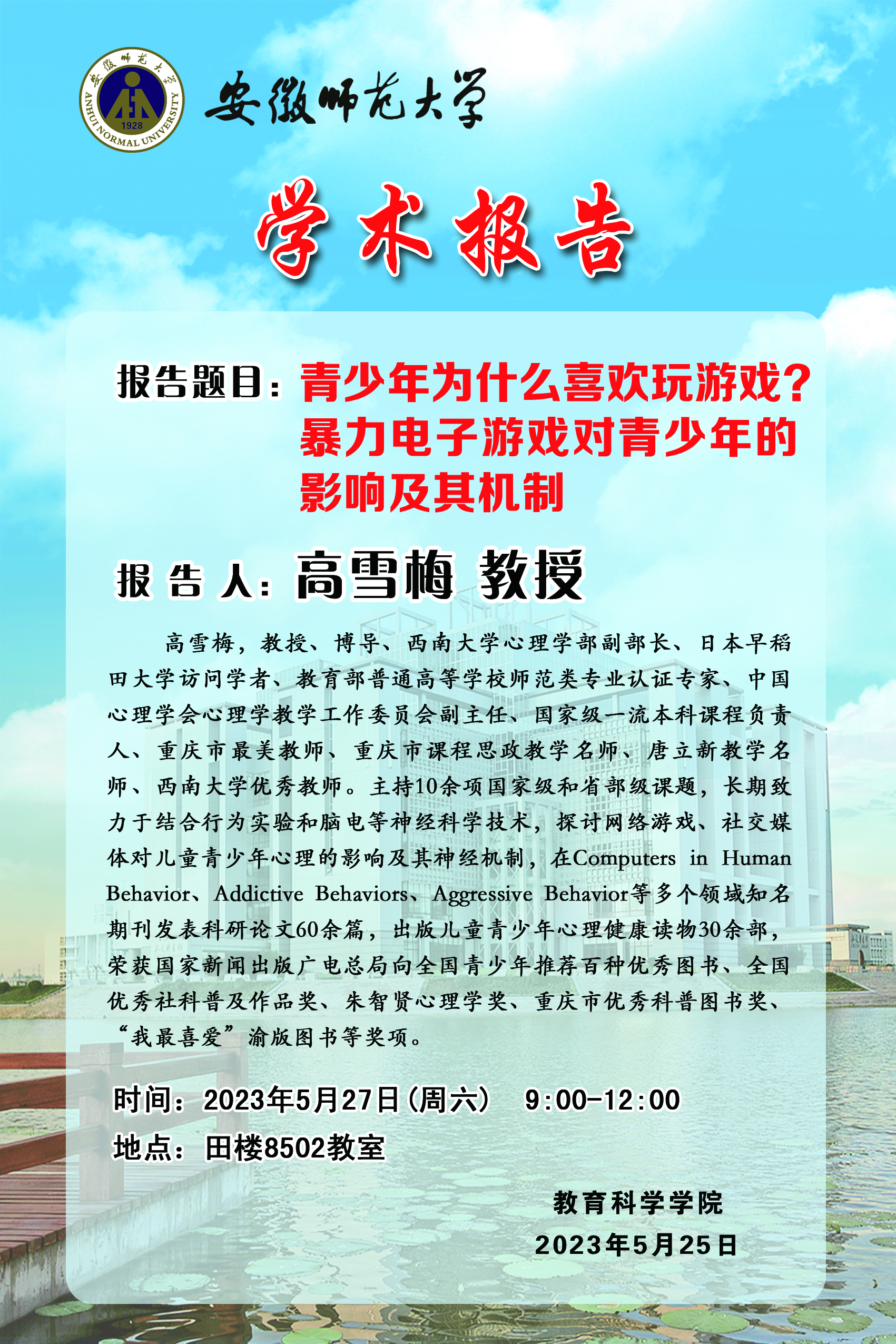 【学术预告】高雪梅:青少年为什么喜欢玩游戏?暴力电子游戏对青少年的影响及其机制