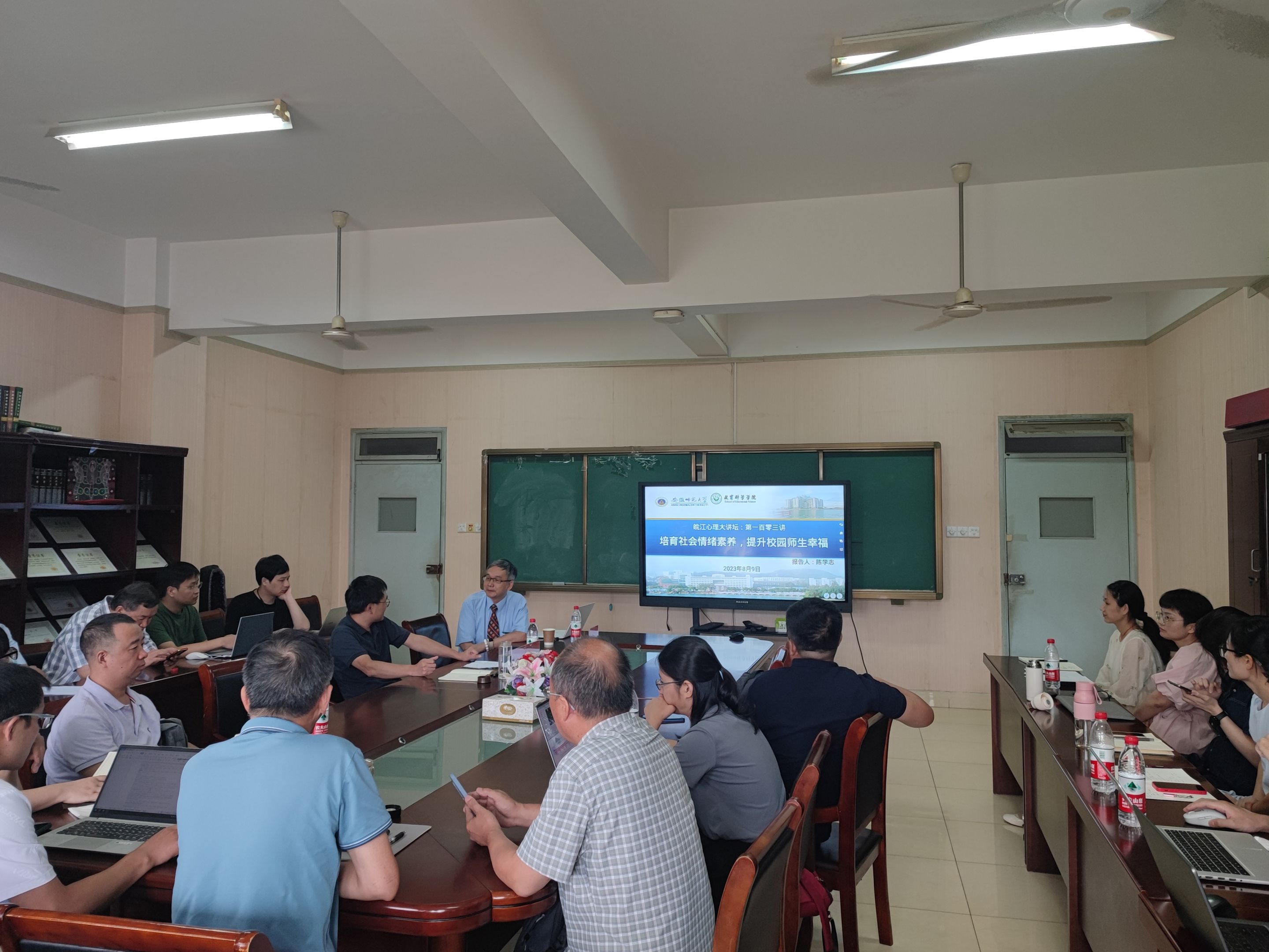 8月9日上午,皖江心理大讲坛第一百零三讲在365英国上市官网408会议室如期开讲。台湾师范大学教育心理与辅导学系研究讲座教授、社会情绪教育与发展研究中心主任主编陈学志教授应邀为全院师生作了题为《培育社会情绪素养,提升校园师生幸福》的学术讲座。讲座由学院副院长韩建涛主持,心理学专业教师、部分留校心理学和心理健康教育专业硕士研究生到场学习。