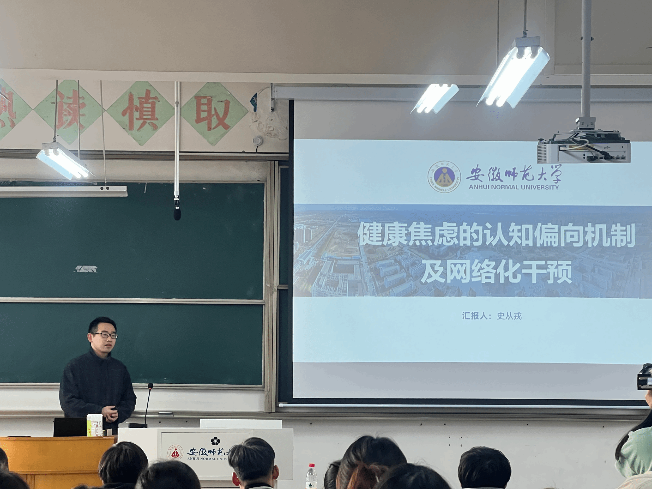讲座伊始,史从戎对健康焦虑的定义、表现及其对个人和社会的影响进行了深入浅出的介绍,他指出随着生活节奏的加快和信息时代的到来,健康焦虑问题日益凸显,已成为一个亟待关注和解决的社会问题。接着,重点阐述了健康焦虑的认知偏向机制。通过丰富的案例和实验数据,详细解析了个体在面对健康信息时可能出现的认知偏差,如过度关注、误解信息、过度解释等,并深入剖析了这些认知偏差如何导致健康焦虑的产生和加剧。在讲座的后半部分,史从戎提出了网络化干预这一创新性的解决方案,他认为,随着互联网的普及和发展,网络化干预为健康焦虑问题的预防和治疗提供了新的可能并详细介绍了网络化干预的原理、方法和应用案例,并分享了他在该领域的最新研究成果。