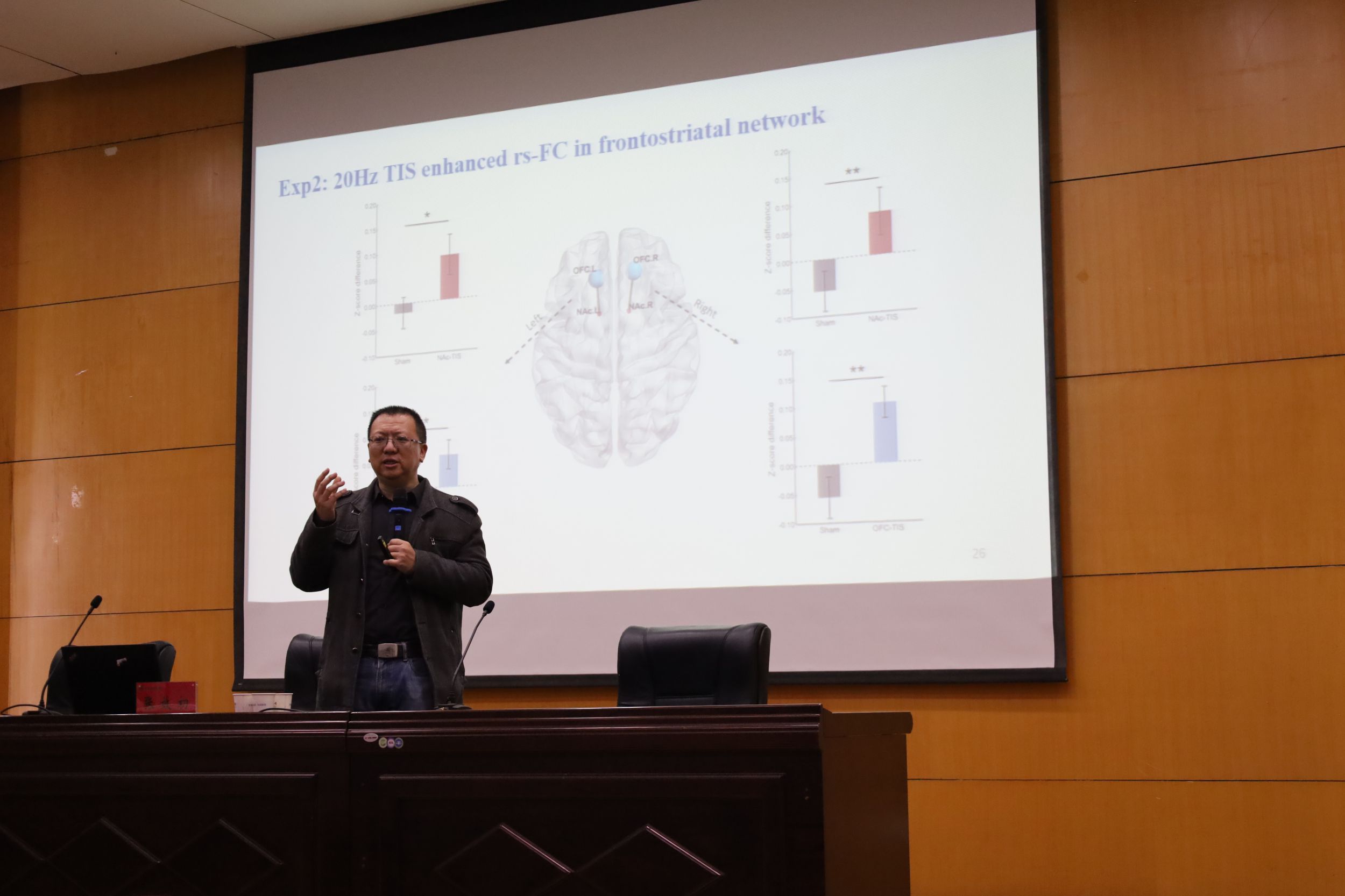 讲座伊始,张效初教授分别介绍了深部脑刺激(DBS)、传统经颅电刺激技术,随后引入此次试验关键技术--“时间干涉的经颅电刺激技术”。通过展示大量专业数据与模型分析,张效初教授总结到,奖励学习是一个关键模式,研究发现其过程主要涉及NAC和OFC,接着对其之间的互动机制进行了深入阐述,最终得出结论:OFC-NAC网络可以奖励引导行为。