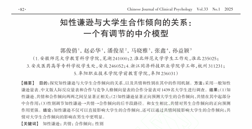 郭俊俏、赵必华(通讯作者)等:知性谦逊与大学生合作倾向的关系:一个有调节的中介模型