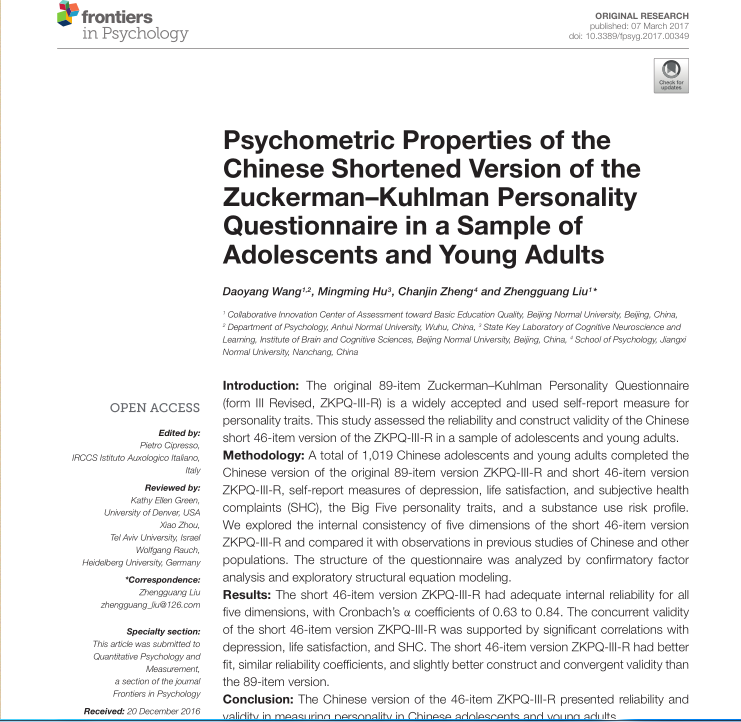 王道阳:Psychometric Properties of the Chinese Shortened Version of the Zuckerman–Kuhlman Personality Questionnaire in a Sam