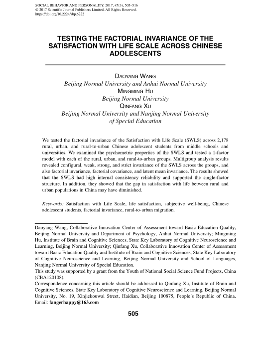 王道阳:TESTING THE FACTORIAL INVARIANCE OF THE SATISFACTION WITH LIFE SCALE ACROSS CHINESE ADOLESCENTS