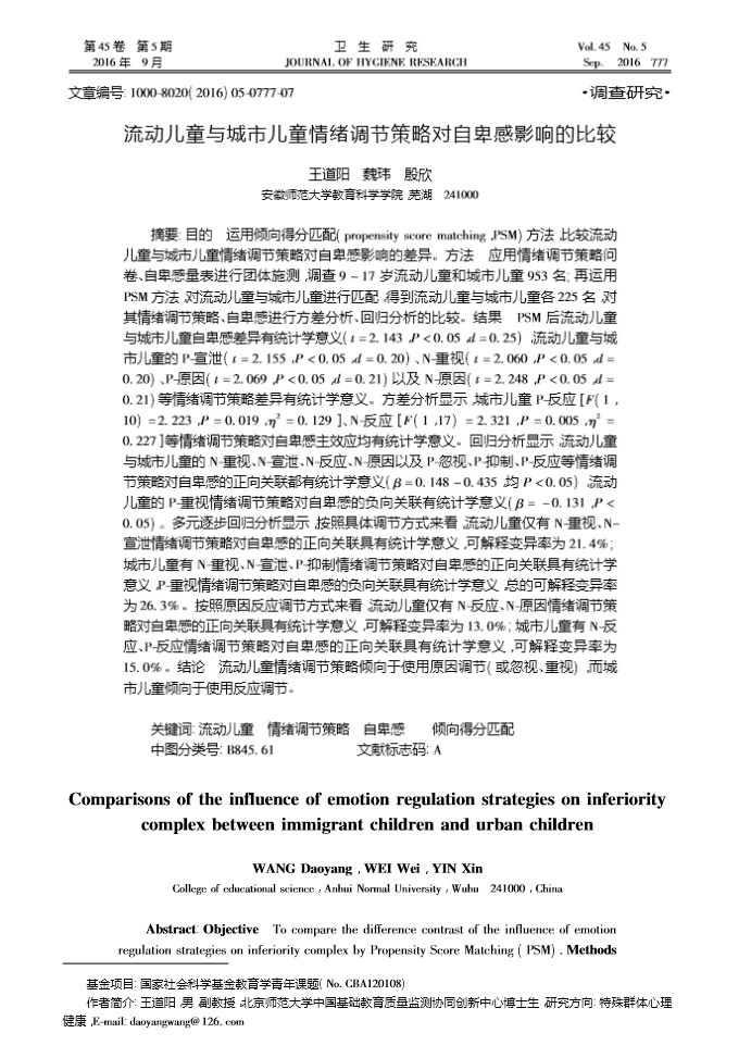 流动儿童与城市儿童情绪调节策略对自卑感影响的比较_王道阳.pdf