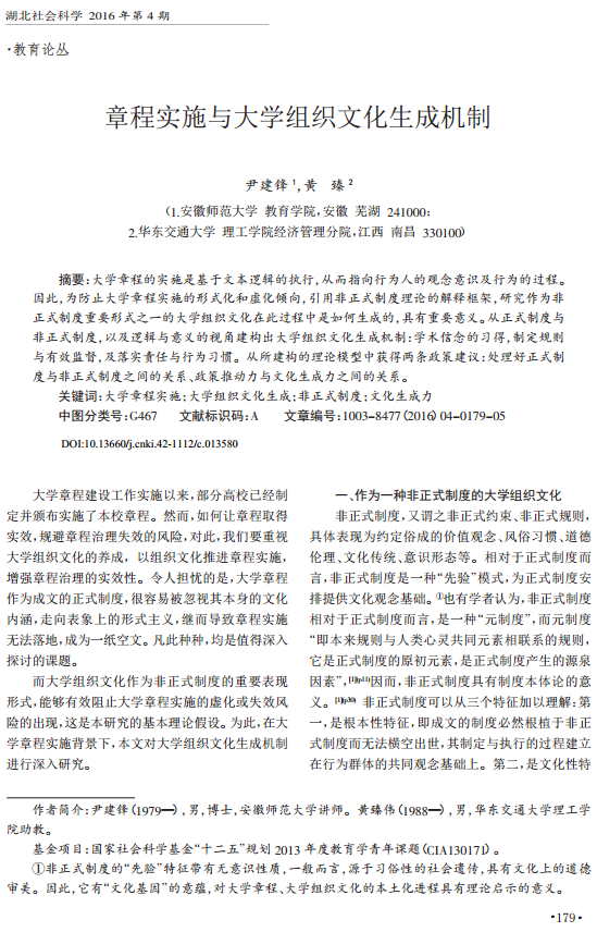 尹建锋,黄 臻:章程实施与大学组织文化生成机制
