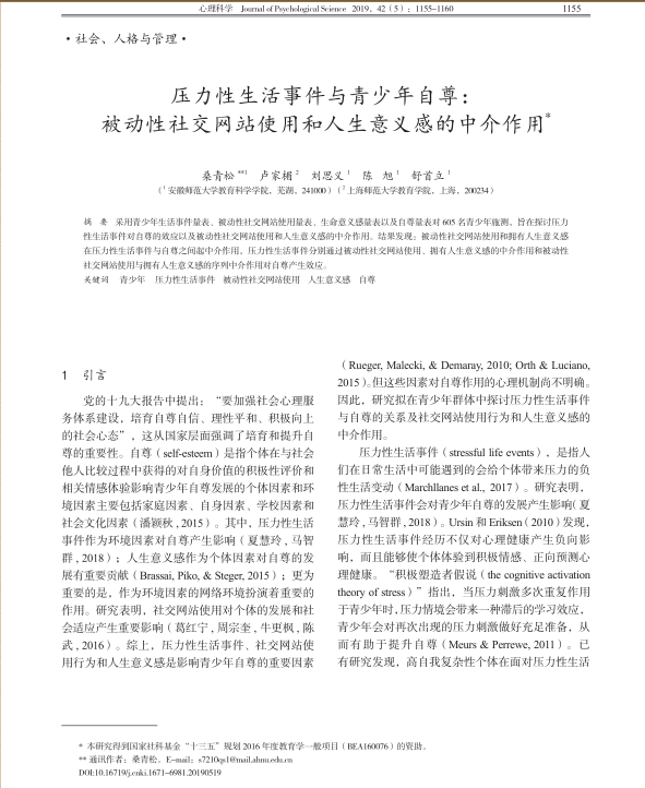 桑青松等:压力性生活事件与青少年自尊:被动性社交网站使用和人生意义感的中介作用