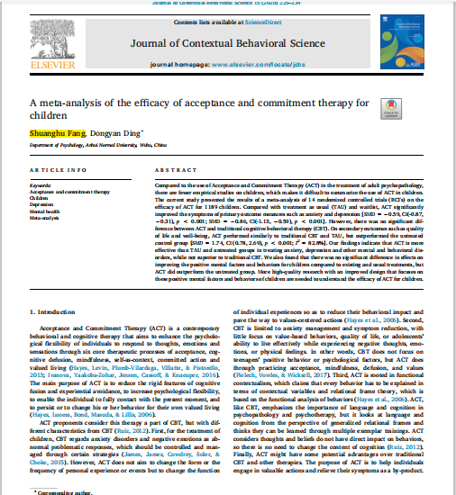 方双虎:A meta-analysis of the efficacy of acceptance and commitment therapy for children