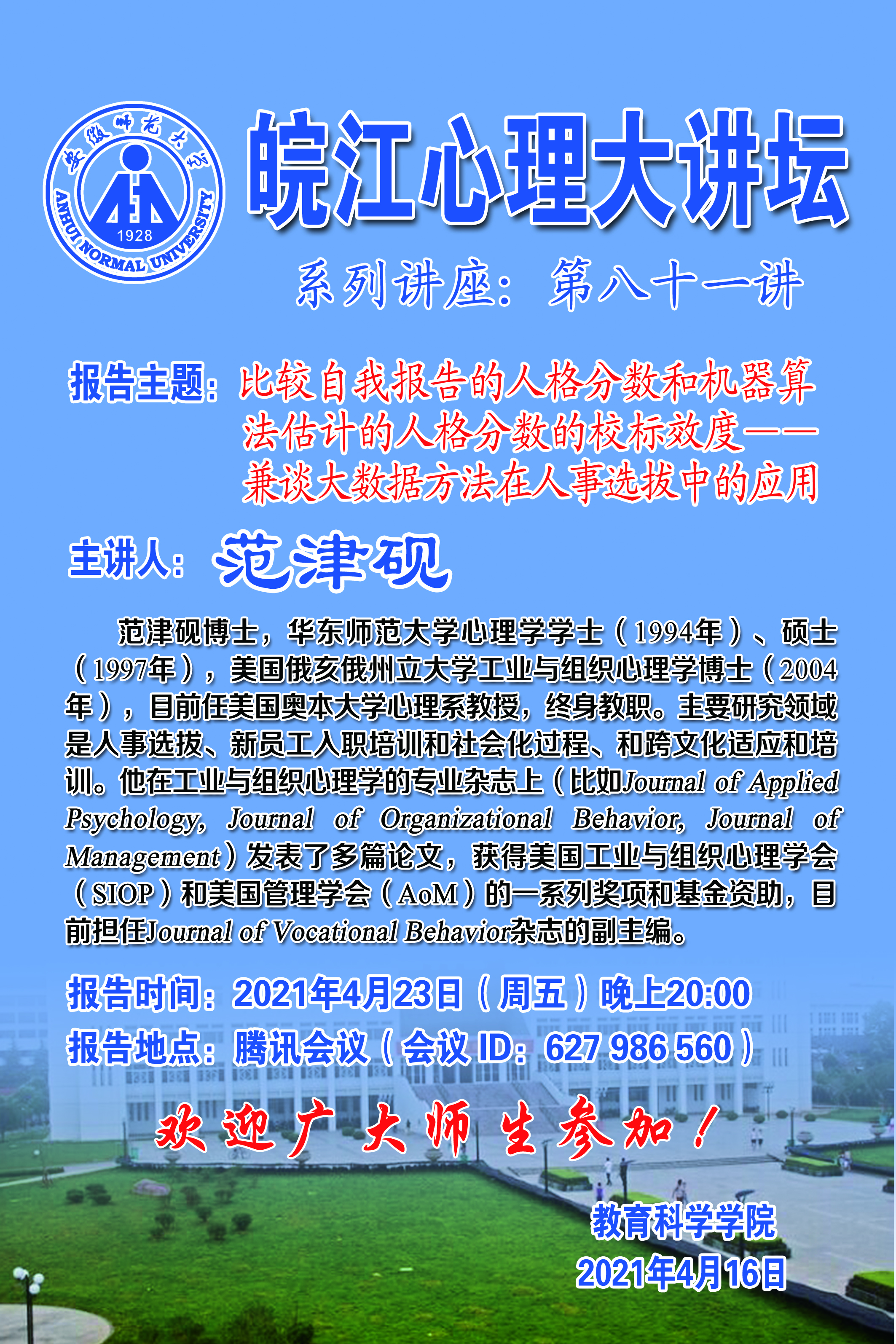 【学术预告】范津砚:比较自我报告的人格分数和机器算法估计的人格分数的校标效度——兼谈大数据方法在人事选拔中的应用