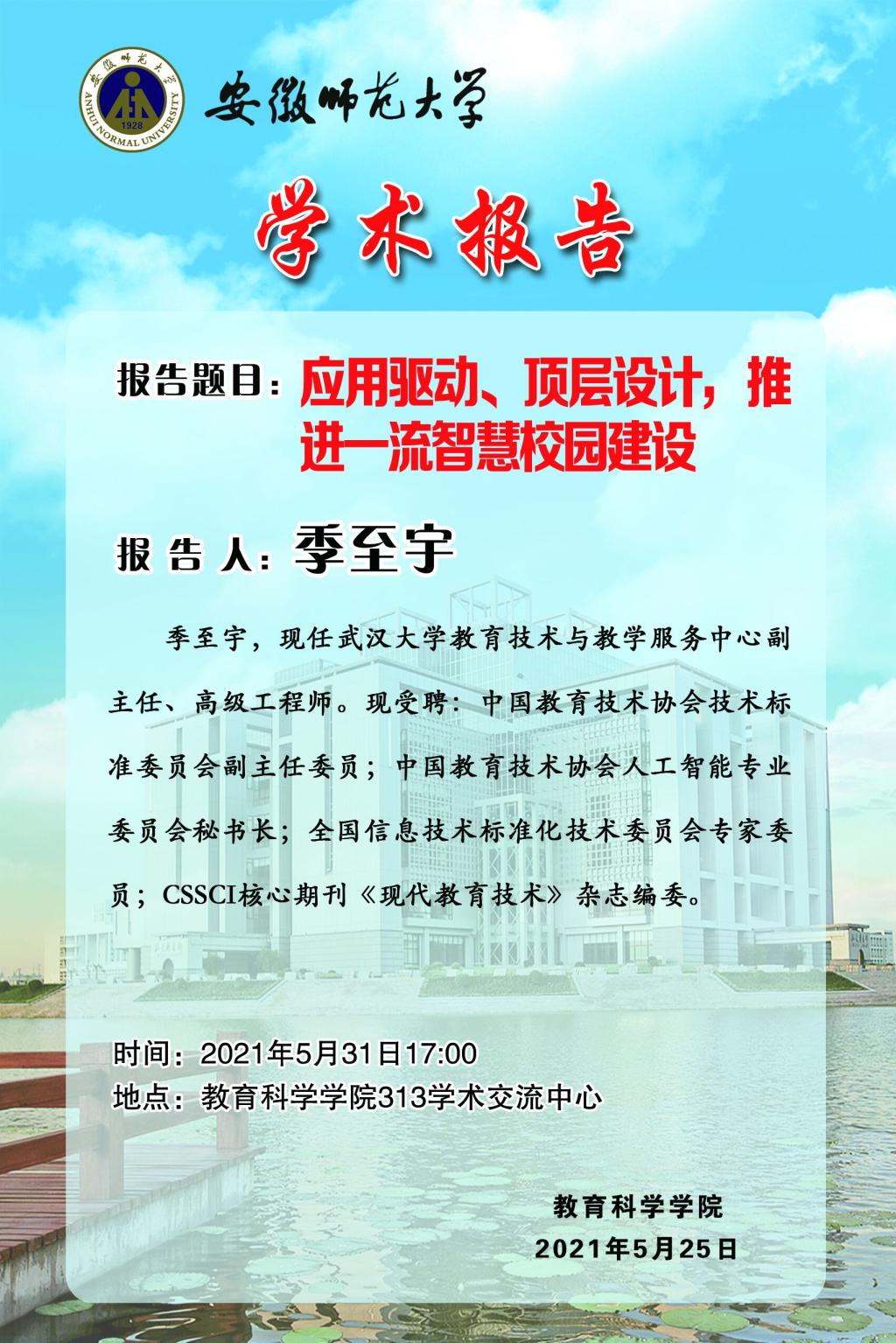 【学术预告】季至宇:应用驱动、顶层设计,推进一流智慧校园建设