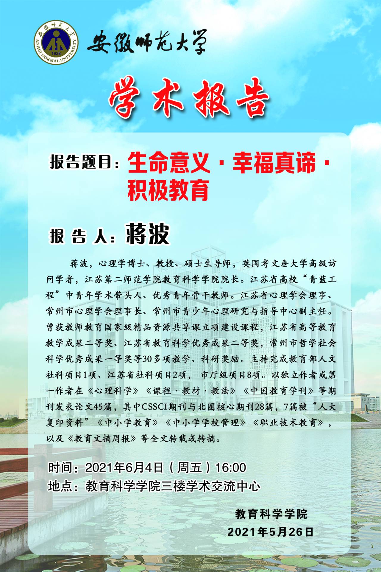 【学术预告】蒋波:生命意义·幸福真谛·积极教育